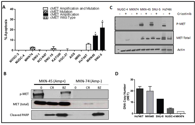 Figure 2: MET amplified gastric cells undergo apoptosis when exposed to crizotinib. (A) Thirteen human gastric cancer lines were incubated with or without 10nM crizotinib for 48 hours, and DNA fragmentation characteristic of apoptosis was measured by propidium iodide (PI) staining and FACS analyses. Values represent normalized results subtracting untreated controls, which were all less than 15%. Student t test, *p≤0.005 crizotinib versus untreated control. (B) One MET amplified and one non-amplified cell line were incubated with or without 100nM crizotinib or 1uM bortezomib for 48 hours. The cells were then lysed and total protein was extracted using RIPA lysis buffer. Total lysates were then subjected to immunoblotting analysis using anti-phospho-MET, anti-total-MET, and anti-cleaved-PARP antibodies. (C) Three MET amplified (Hs746t, SNU-5 and MKN45) and two non-amplified cell lines (MKN74 and NUGC-4) were incubated with or without 100nM crizotinib 24 hours, and total protein was extracted using RIPA lysis buffer. Total lysates were then analyzed by immunoblotting using anti-phospho-MET, anti-total-MET, and β-actin antibodies. (D) MET DNA copy numbers were analyzed using TaqMan copy number assays. Three cell lines Hs746t, SNU-5 and MKN45 had high level MET amplification with average copy numbers of 22, 13 and 20, respectively. Data are means ± SEM from two biological replicates.