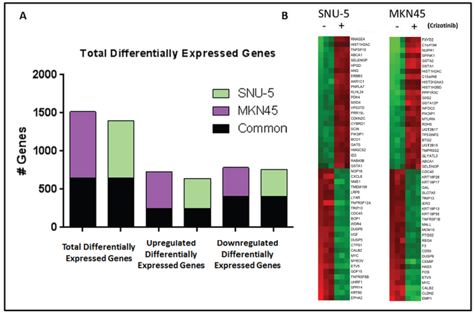 Figure 3: MET inhibition results in significant changes in gene expression in MET amplified gastric cancer cell lines. (A) Graph representing the total number of genes that had a P<0.001 with FDR <0.05 and 2-fold cut-off in the two MET amplified cell lines following incubation with crizotinib for 24 hours (left). The total number of genes up-regulated (middle) and down-regulated (right) following incubation with crizotinib for 24 hours, with the number of common genes between the two cell lines shaded in black. (B) Heat map of the top 50 differential expressed genes for each cell line following incubation with crizotinib for 24 hours. Red, higher relative expression; green, lower relative expression.