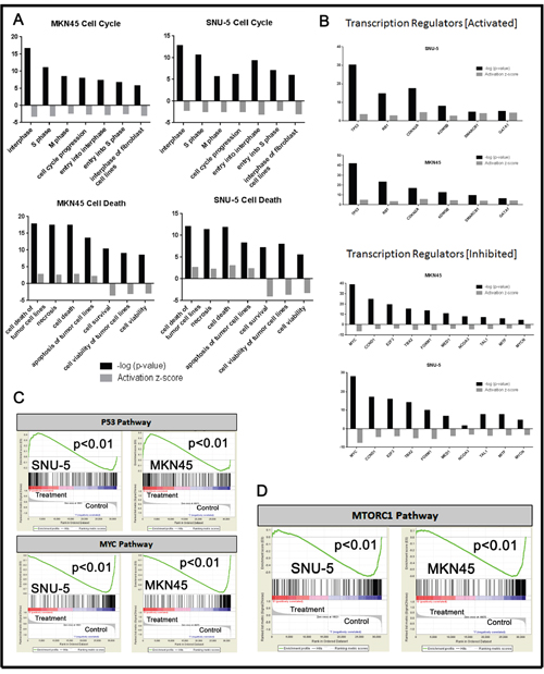 Figure 4: Pathway analyses of crizotinib-induced changes in gene expression. (A) Significant changes in gene expression were analyzed using Ingenuity Pathway Analysis (IPA) using the molecular and cellular functions of the platform. (B) Significantly activated/inhibited transcriptional regulators from whole genome mRNA expression profiling using IPA. (C and D) Selection of the top common results within GSEA H: hallmark gene sets from the molecular gene sets database are displayed for each of the cell lines. All results within the GSEA analysis have a P<.01 and FDR <.05.