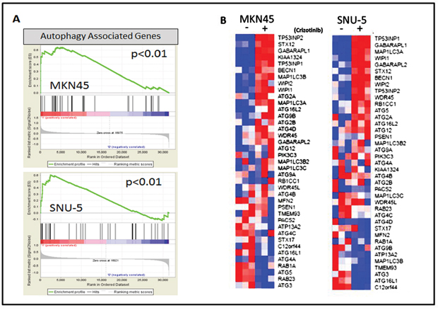 Figure 5: MET inhibition stimulates an autophagy gene expression signature. (A) Gene set enrichment analysis (GSEA) was used to determine whether a gene expression signature associated with autophagy (BP: GO biological process gene set) was stimulated by crizotinib in the SNU-5 (P<.01, FDR= .04) and MKN45 (P<.01, FDR= .07) cells. (B) Expression of the top differentially expressed autophagy-associated genes included in the GSEA data set (GO autophagosome organization) used in panel A. The heat maps depict relative expression of autophagy markers in two MET amplified cell lines following incubation with crizotinib for 24 hours. Red, higher relative expression; blue, lower relative expression.
