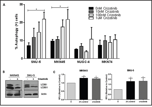 Figure 6: MET inhibition induces autophagy in the crizotinib-sensitive cells. (A) Crizotinib induces autophagy in a concentration-dependent fashion. The indicated human gastric cancer cell lines were incubated with increasing concentrations of crizotinib (0, 10, 100, 1000nM) for 72 hours and autophagy was accessed by acridine orange staining coupled with flow cytometry. The SNU-5 and MKN45 cells contain high level MET amplification, whereas the NUGC-4 and MKN74 cells do not. (B) Crizotinib induces LC3-II processing. SNU-5 and MKN45 cells were incubated with 100nM crizotinib with for 24hrs and LC3 expression was analyzed by Western blotting. (C) Crizotinib causes increased autophagic flux in the drug-sensitve cells. SNU-5 and MKN45 cells were incubated with 100nM crizotinib with for 24hrs and autophagy was accesses by fluorescence microplate reader with the application of Cyto-ID autophagy detection kit. Data are means ± SEM from three independent experiments. Student t test, *p≤0.05.