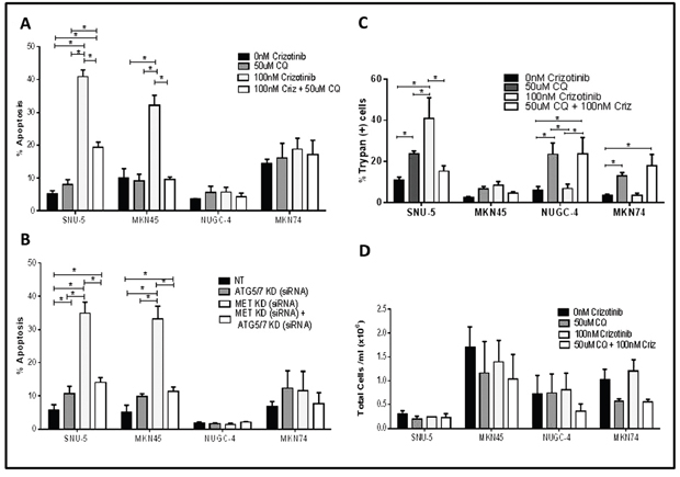 Figure 7: Autophagy is required for crizotinib-induced apoptosis. (A and B) Effects on apoptosis. (A) Gastric cancer cell lines (SNU-, MKN45, MKN74, and NUGC-4) were incubated with or without 100nM crizotinib, 50uM chloroquine (CQ) and 100nM crizotinib + 50uM chloroquine for 48 hours and PI-FACS was used to quantify cells with fragmented DNA due to apoptosis. Student t test, *p≤0.0005. (B) Gastric cancer cell lines (SNU-5, MKN45, MKN74, and NUGC-4) were transfected with a non-targeting (NT) or MET siRNA, ATG5/7siRNA or MET siRNA + ATG5/7 siRNA for 48 hours and PI-FACS was used to quantify apoptotic cell death. (C and D) Effects on necrosis. Gastric cancer cell lines (SNU-, MKN45, MKN74, and NUGC-4) were incubated with or without 100nM crizotinib, 50uM chloroquine (CQ) or 100nM crizotinib + 50uM chloroquine for 72 hours and trypan blue exclusion/ ViCELL was used to quantify total cell death and absolute cell numbers. Data are means ± SEM from three independent experiments. Student t test, *p≤0.05.