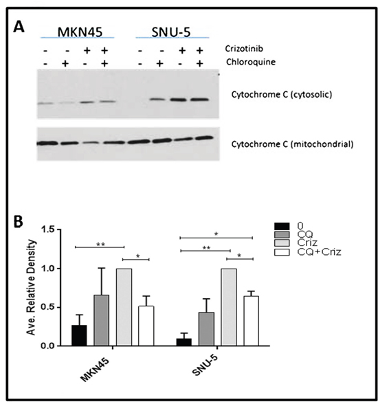 Cytochrome c release from mitochondria is a central commitment point for apoptotic cell death. We therefore wondered whether autophagy inhibition might attenuate apoptosis by preventing crizotinib-induced cytochrome c release (Figure 8). To test this hypothesis, we incubated the SNU-5 or MKN45 cells with crizotinib with or without chloroquine for 6 h and measured cytosolic cytochrome c levels by immunoblotting as described previously [31]. Chloroquine caused statistically significant inhibition of cytochrome c release in both cell lines (representative immunoblots are displayed in Figure 8A, and the results of 3 independent experiments are quantified in Figure 8B).