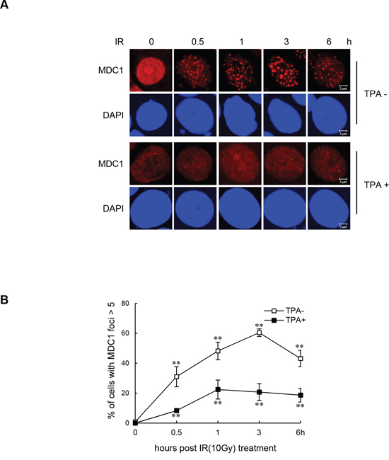 Figure 2: Impaired IR-induced MDC1 foci formation in differentiated MCF-7 cells. (A) Undifferentiated MCF-7 cells and TPA-differentiated MCF-7 cells were irradiated with 10 Gy and fixed for immunofluorescence staining of MDC1 at the indicated time points. (B) Quantification of IR-induced MDC1 foci in undifferentiated MCF-7 cells and TPA-differentiated MCF-7 cells. Results are shown as mean ± s.d. (n = 3); **P < 0.01.
