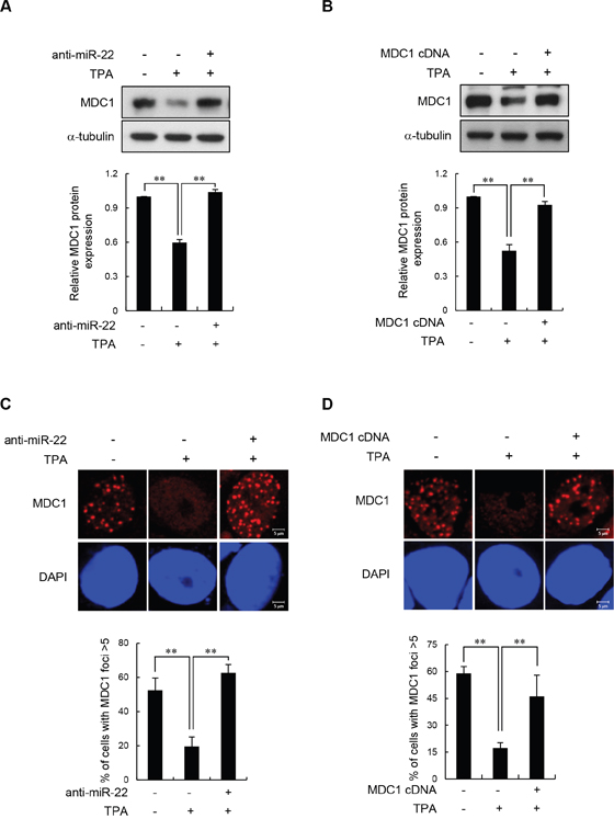 Figure 3: Effect of miR-22 on IR-induced MDC1 foci in differentiated MCF-7 cells. (A and B) Untreated and TPA-treated MCF-7 cells were transfected with anti-miR-22 (A) or miR-22-insensitive MDC1 cDNA (B). After a 24 h transfection, the cells were irradiated with 10 Gy IR. 3 hr after irradiation, the protein level of MDC1 was measured by Western blot (top). Quantitative densitometry of MDC1 protein expression is shown below, expressed as the mean ± s.d. (n = 3); ** P < 0.01. (C and D) MCF-7 cells underwent the same treatment as A and B and then were analyzed by immunofluorescence for MDC1 foci formation 3 hr postirradiation. DAPI was used for nuclear staining. In all panels, mean ± s.d. is shown; **P < 0.01 versus the control group.