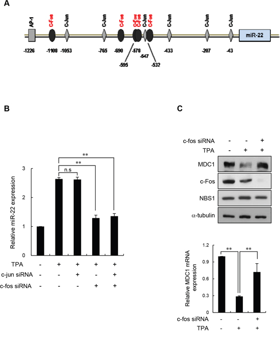 Figure 5: c-Fos negatively regulates MDC1 via miR-22 in differentiated MCF-7 cells. (A) Representation of the human -1.3 kb miR-22 promoter fragment. Transcription factor analysis of the proximal promoter showing the six c-Jun and five c-Fos binding sites using the PROMO program. (B) TPA-differentiated MCF-7 cells were transiently transfected with either c-Jun or c-Fos siRNA. Endogenous miR-22 levels in the indicated cells were measured using real-time qPCR. Data were normalized to U6. Results are shown as mean ± s.d. (n = 3); **P < 0.01. (C) TPA-treated MCF-7 cells were transiently transfected with c-Fos siRNA or a control siRNA, and indicated protein levels were determined by Western blotting (top). Expression of MDC1 mRNA was quantitated using real-time qPCR. Data represent mean ± s.d. (n = 3); ** P < 0.01.