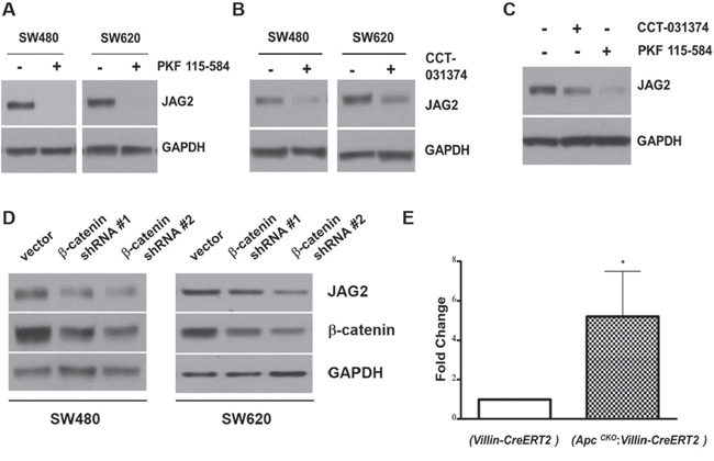 Figure 2: β-catenin regulates JAG2 expression. SW480 and SW620 cells were incubated with 1 μM PKF 115-584 (A) or 25 μM CCT-031374 (B) for 24 hours. Total cell lysates were subjected to Western blot analysis for JAG2. (C) HCT116 cells were incubated with 1 μM PKF 115-584 or 25 μM CCT-031374 for 24 hours. JAG2 expression was analyzed by Western blot analysis. (D) SW480 and SW620 cells were transduced with lentiviral shRNAs against β-catenin. 72 hours after transduction, total cell lysates were subjected to Western blot analysis for JAG2 and β-catenin. All Western blot images are representative of at least three independent experiments. (E) qRT-PCR analysis of JAG2 mRNA levels in control (Villin-CreERT2) and conditional Apc knockout (ApcCKO:Villin-CreERT2) mice. The mice were intra-peritoneally injected with tamoxifen. RNA was isolated from small intestines of the injected mice at 4 days after Cre activation. The relative expression level of JAG2 mRNA was normalized to GAPDH. Data were expressed as fold change over tamoxifen-injected control mice (Villin-CreERT2, n=3, * for p < 0.05).