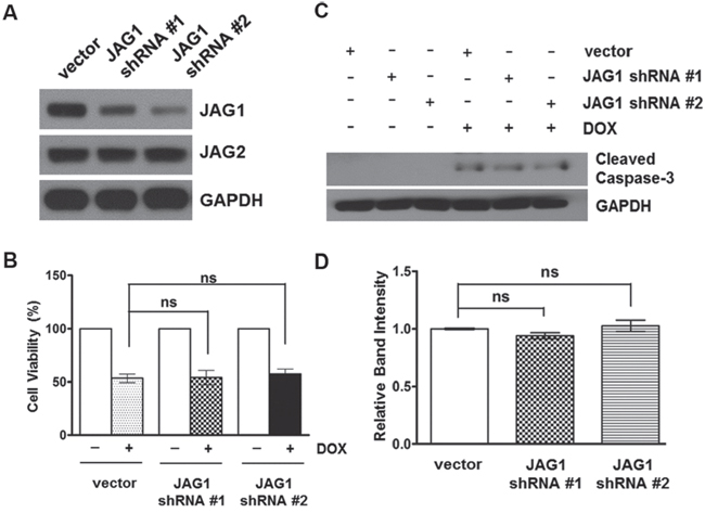 Figure 6: Silencing of JAG1 does not affect the sensitivity of HCT116 cells to doxorubicin. (A) Western blot analysis of JAG1 and JAG2 in HCT116 cells transduced with empty vector or JAG1 shRNA-encoding lentivirus. (B) Control and JAG1-knockdown HCT116 cells were treated with 1 μM doxorubicin (DOX) for 48 hours. Cell viability was determined by trypan blue assay and expressed as a percentage of vehicle-treated cells (n=3)., ns: non-significant. (C) Control and JAG1-knockdown HCT116 cells were treated with 1 μM DOX for 48 hours. Total cell lysates were subjected to Western blot analysis for cleaved caspase-3. The Western blot is representative of 3 independent experiments (n=3). (D) Quantification of cleaved caspase-3. The graph shows fold changes of GAPDH-normalized cleaved caspase-3 over DOX-treated control cells.