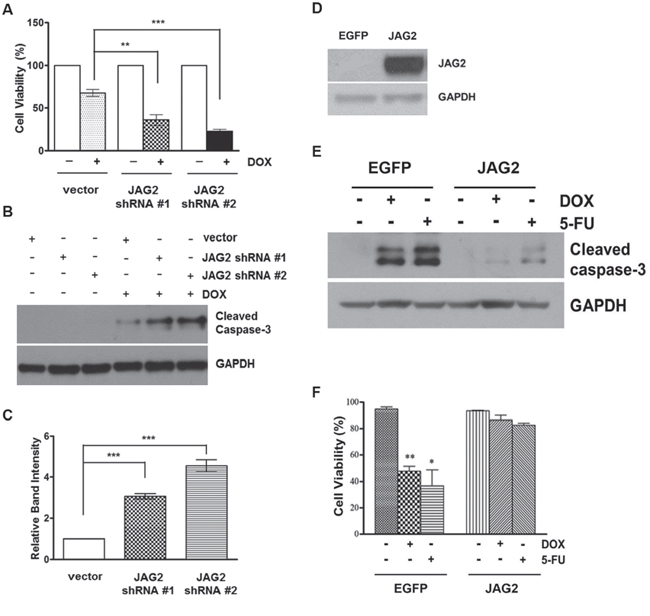 Figure 7: Knockdown of JAG2 sensitizes p53-null HCT116 cells to doxorubicin. (A) Control and JAG2-knockdown p53-null HCT116 cells were treated with 1 μM doxorubicin (DOX) for 48 hours. Cell viability was determined by trypan blue assay and expressed as a percentage of vehicle-treated cells. Bar graphs show mean ± SD of percent decrease of viable cells over DMSO-treated control (100%). (B) Control and JAG2-knockdown p53-null HCT116 cells were treated with 1 μM DOX for 48 hours. Total cell lysates were subjected to Western blot analysis for cleaved caspase-3. (C) The graph shows fold changes of GAPDH-normalized cleaved caspase-3 over DOX-treated control cells. (D) Western blot analysis of JAG2 expression in control (EGFP) and JAG2 over-expressing HT29 cells. X-ray film was exposed for a shorter duration to properly visualize JAG2 expression in JAG2 over-expressing HT-29 cells. (E) Control and JAG2 over-expressing HT29 cells were treated with 1 μM doxorubicin or 300 μM 5-FU for 48 hours for 24 hours. Total cell lysates were subjected to Western blot analysis for cleaved caspase-3. All Western blot images are representative images from at least 3 independent experiments. (F) Calcein AM/DAPI viability assay. Control and JAG2 over-expressing HT29 cells were treated with 1 μM doxorubicin or 300 μM 5-FU for 48 hours. Treated cells were stained with Calcein AM and DAPI for visualization of live and dead cells, respectively. Data are presented as the percent of live cells.