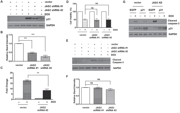 To determine whether p21 is involved in increased sensitivity of JAG2-knockdown cells to DOX, we stably knocked down JAG2 in p21-null HCT116 cells. As shown in Figure 8D, DOX-induced cytotoxicity was not significantly altered between control and JAG2-knockdown p21-null HCT116 cells. Moreover, the levels of cleaved caspase-3 were not significantly different between control and JAG2-knockdown p21-null HCT116 cells (Figure 8E and 8F). To provide further evidence that reduced p21 expression is responsible for increased sensitivity of JAG2-knockdown cells to DOX, we examined whether forced expression of p21 can rescue the increased apoptosis in JAG2-knockdown cells. To test this, p53 wild-type control and JAG2-knockdown HCT116 cells were transduced with the lentivirus encoding human p21. Twenty-four hours later, the transduced cells were treated with DOX, and expression of cleaved caspase-3 was examined. As shown in Figure 8G, the level of cleaved caspase-3 was significantly up-regulated in DOX-treated JAG2-knockdown cells compared to that in DOX-treated control cells (lane 2 vs. lane 6). However, this increase was suppressed by forced expression of p21 (lane 6 vs. lane 8). Taken together, our data suggest that silencing of JAG2 interferes with DOX-induced cell cycle arrest through suppression of p21 expression, leading to increased apoptosis.
