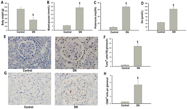 DN rats developed overt diabetes with higher blood glucose concentrations and lower body weights after the injection of STZ (Figure 1A, 1B). In addition, 24h-urinary proteinuria and serum creatinine (Scr) were markedly increased in diabetic rats than in non-diabetic rats (Figure 1C, 1D). Apoptosis in podocytes detected by TUNEL was significantly increased in the diabetic group compared with the non-diabetic group (Figure 1E, 1F).