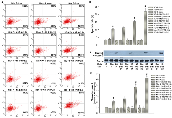 Figure 2: Macrophages promoted podocytes apoptosis in the condition of high glucose. Flow cytometry analysis of podocytes apoptosis with Annexin V-FITC/PI staining (A). Percentage of apoptotic podocytes (B). Representative western blotting analysis of cleaved caspase 3 in podocytes (C). β-actin was used as an internal control. Quantification of cleaved caspase 3 protein expression (D). NC+P alone: podocytes treated with normal PRMI 1640 media. Man+P alone: Podocytes treated with 25 mM mannitol. HG+P alone: Podocytes treated with 25 mM high glucose. NC+P+M : Transwell co-culture of podocytes (P) and RAW 264.7 cells (M) in the absence of 25 mM high glucose at indicated ratios of P to M. Man+P+M: Transwell co-culture of P and M in 25 mM mannitol at indicated ratios of P to M. HG+P+M: Transwell co-culture of P and M in the presence of 25 mM high glucose at indicated ratios of P to M. Data were presented as mean ± SD from three independent experiments. *P<0.05 vs. NC+P alone group; #P<0.05 vs. HG+P alone group.