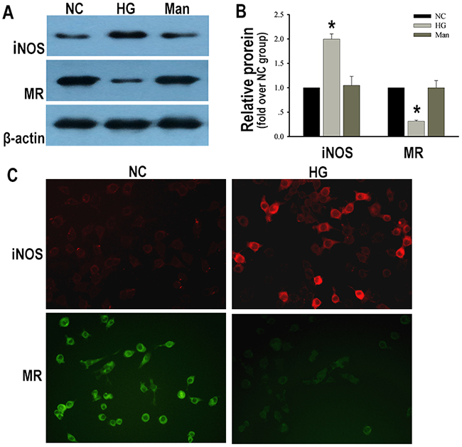 Next, we detected macrophages phenotypes in the status of high glucose in vitro. The classical marker of M1 (iNOS) and specific marker of M2 macrophages (MR) [9] were measured. After stimulation with high glucose, macrophages increased their expression of iNOS. Additionally, MR was decreased when macrophages were exposed to high glucose compared with those exposed to normal glucose (Figure 3). These data indicated that macrophages displayed pro-inflammatory M1 activation in the condition of high glucose.