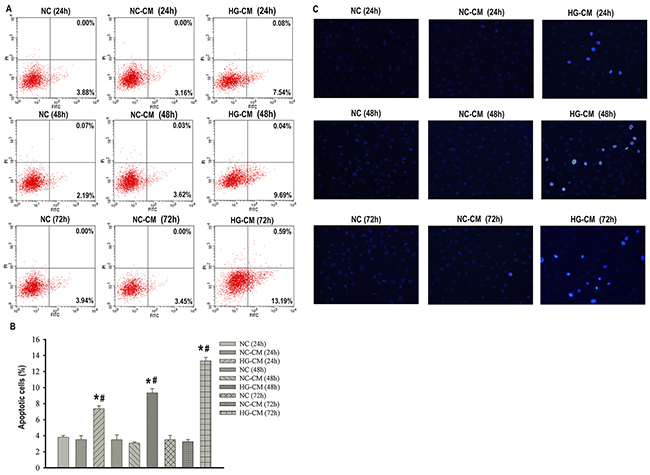 Figure 4: Conditioned media from high glucose-activated macrophages (HG-CM) promoted podocytes apoptosis. Flow cytometry analysis of podocytes apoptosis with Annexin V-FITC/PI staining (A). Percentage of apoptotic podocytes (B). Hoechst-33342 staining of apoptotic podocytes (×200) (C). NC: podocytes treated with norml RPMI 1640 media for indicated time. NC-CM: podocytes treated with NC-CM for indicated time. HG-CM: podocytes treated with HG-CM for indicated time. Data were presented as mean ± SD from three independent experiments. *P<0.05 vs. NC group; #P<0.05 vs. NC-CM group at the same time point, respectively.
