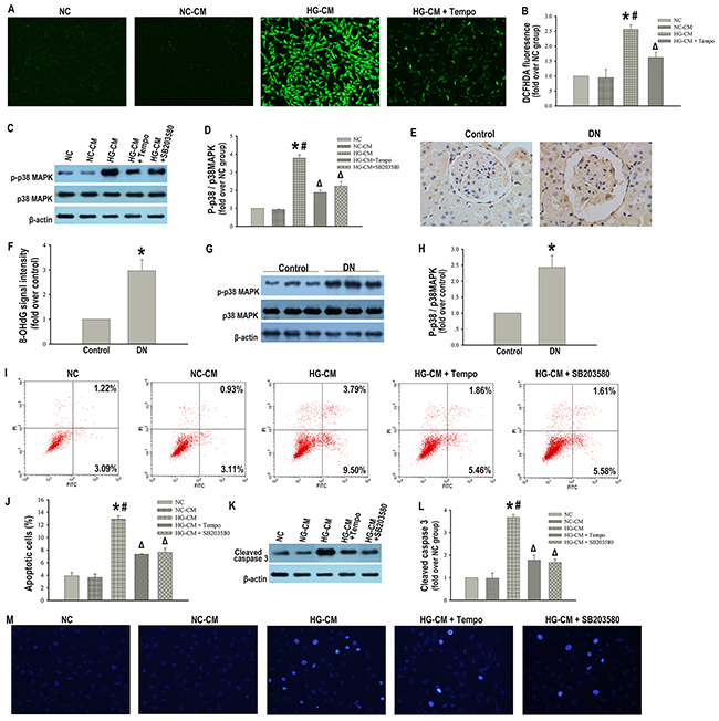 Figure 5: Apoptosis in podocytes triggered by high glucose-activated macrophages was ROS-p38MAPK dependent. Representative DCFHDA staining of ROS in podocytes (×100) (A). Quantitative analysis of ROS (B). Representative western blotting analysis of p-p38MAPK and p38MAPK in podocytes (C). β-actin was used as an internal control. Quantification of p-p38MAPK/p38MAPK in podocytes (D). Immunohistochemical staining of 8-OHdG in glomerulus (× 400) of control or diabetic rats (E). Semiquantitative analysis of 8-OHdG signal intensity (F). Representative western blotting analysis of p-p38MAPK and p38MAPK in glomerular lysates of control or diabetic rats (G). Quantification of p-p38MAPK/p38MAPK in glomerular lysates (H). Data were presented as mean ± SD (n=8). *P <0.05 vs. control group. Flow cytometry analysis of podocytes apoptosis with Annexin V-FITC/PI staining (I). Percentage of apoptotic podocytes (J). Representative western blotting analysis of cleaved caspase 3 in podocytes (K). Quantification of cleaved caspase 3 protein expression in podocytes (L). Hoechst-33342 staining of apoptotic podocytes (×200) (M). NC: podocytes treated with norml RPMI 1640 media. NC-CM: podocytes treated with NC-CM. HG-CM: podocytes treated with HG-CM. HG-CM + Tempo: podocytes treated with HG-CM and a ROS inhibitor (Tempo). HG-CM + SB203580: podocytes treated with HG-CM and a MAPK inhibitor (SB203580). Data were presented as mean ± SD from three independent experiments. *P<0.05 vs. NC group; #P<0.05 vs. NC-CM group;ΔP<0.05 vs. HG-CM group.