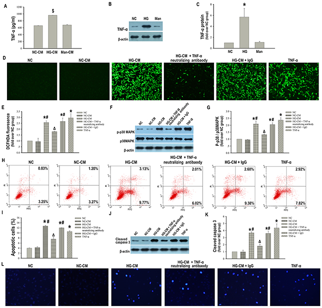 Figure 6: Macrophages derived TNF-α is required to promote apoptosis in podocytes. ELISA assay of TNF-α level in the culture supernatant of macrophages (A). Representative western blotting analysis of TNF-α in macrophages (B). β-actin was used as an internal control. Quantification of TNF-α in macrophages (C). NC-CM: CM from normal glucose-treated RAW 264.7 cells. HG-CM: CM from 25 mM high glucose-treated RAW 264.7 cells. Man-CM: CM from 25 mM mannitol-treated RAW 264.7 cells. NC: RAW 264.7 cells treated with normal glucose. HG: RAW 264.7 cells treated with 25 mM high glucose. Man: RAW 264.7 cells treated with 25 mM mannitol. Data were presented as mean ± SD from three independent experiments. $P < 0.05 vs. NC-CM group; *P< 0.05 vs. NC group. Representative DCFHDA staining of ROS (×100) (D). Quantitative analysis of ROS (E). Representative western blotting analysis of p-p38MAPK and p38MAPK in podocytes (F). Quantification of p-p38MAPK/p38MAPK in podocytes (G). Flow cytometry analysis of podocytes apoptosis with Annexin V-FITC/PI staining (H). Percentage of apoptotic podocytes (I). Representative western blotting analysis of cleaved caspase 3 in podocytes (J). Quantification of cleaved caspase 3 protein expression in podocytes (K). Hoechst-33342 staining of apoptotic podocytes (×200) (L). NC: podocytes treated with norml RPMI 1640 media. NC-CM: podocytes treated with NC-CM. HG-CM: podocytes treated with HG-CM. HG-CM + TNF-α neutralizing antibody: podocytes treated with HG-CM and anti-TNF-α neutralizing antibody. HG-CM + IgG: podocytes treated with HG-CM and IgG1. TNF-α: podocytes treated with TNF-α. Data were presented as mean ± SD from three independent experiments. *P< 0.05 vs. NC group; #P < 0.05 vs. NC-CM group; ΔP<0.05 vs. HG-CM group.