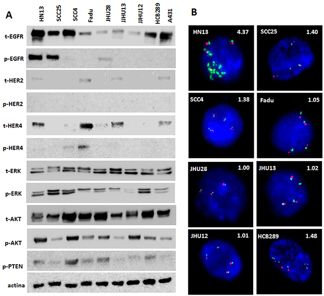 Figure 1: Protein profile and FISH analyses of HNSCC cell lines. Total and phosphorylated profile of ErbB family and intracellular pathways, AKT, ERK and total PTEN detected by Western Blot (A). FISH analysis of EGFR gene (green); Centromeric DNA (CEN7) was used as reference (Red). Nuclei were counterstained with DAPI (blue). Magnification: 100X. EGFR/CEN7 ratios are shown above each photograph (B).