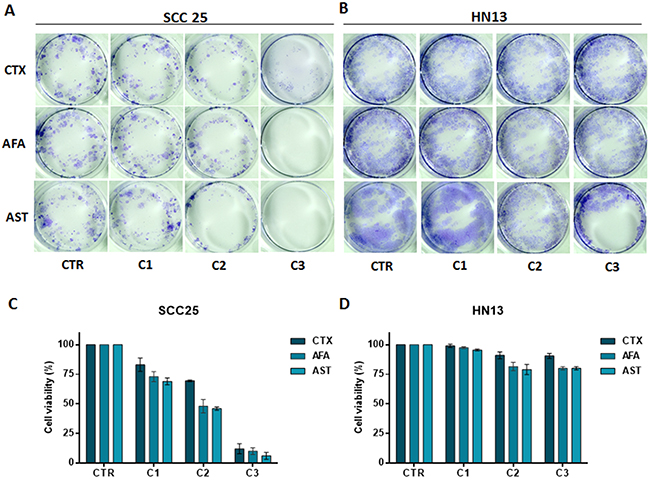 Figure 3: Clonogenic assay of SCC25 (A) and HN13 cell lines (B). Cells treated with cetuximab (100, 150 and 250 μg/mL) or afatinib and allitinib (100, 200, and 500 nM). Bars graph represent the relative colony growth of SCC25 (C) and HN13 cell line (D). CTR: control; C1, C2 and C3: incremental doses of each anti-EGFR. Data presented as mean of three independent experiments.