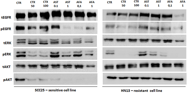 Figure 4: Analysis of EGFR, ERK and AKT total and phosphorylated in SCC25 (highly sensitive) and HN13 cell lines (resistant) by Western Blot. EGF ligand was used at 10 ng/mL for 10 minutes. CTR: control; CTX: cetuximab at 50 or 100 μg/mL; AFA: afatinib and AST: allitinib at 0.01 or 0.1 μM.