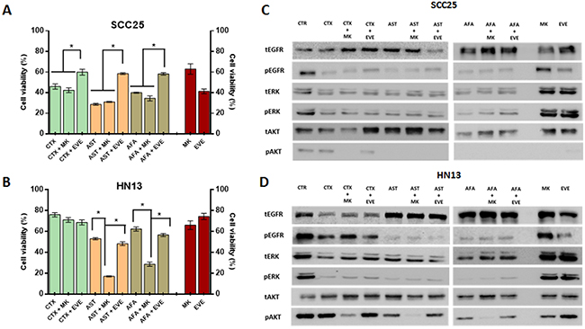 Figure 5: Anti-EGFR therapeutic combinations with intracellular inhibitor MK2206 and everolimus. Viability assay (MTS) for SCC25 and HN13 cell lines exposed to cetuximab (250 μg/mL) allitinib or afatinib (1 μM) with or without MK2206 (2.5 μM) and everolimus (EVE) for 72 hours (A and B). CTR: control. Results from combinations were expressed in relation to the DMSO control. Red bars represents cell viability percentage of the Everolimus and MK2206 alone at fixed concentration (2.5 μM). Western Blot analysis of EGFR, ERK and AKT total and phosphorylated in SCC25 (highly sensitive) (C) and HN13 cell lines (resistant) (D) treated with the AKT inhibitor MK2206 (MK) and mTOR inhibitor everolimus (EVE) at 2.5 μM. SCC25 and HN13 cell lines were exposed to cetuximab (50 μg/mL), allitinib or afatinib (0.01 nM for SCC25 and 0.1 nM for HN13 cell line).