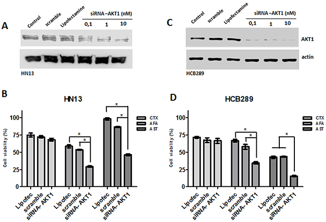 Figure 6: Role of AKT knockdown in cetuximab (CTX) and afatinib (AFA) and allitinib (AST) response in HN13 and HCB289 cell lines. (A and C) Analysis of AKT knockdown efficiency on HN13 and HCB289 at different AKT siRNA concentrations by Western blot. (B and D) Viability assay (MTS) for HN13 and HCB289 cells exposed to Cetuximab (CTX) 250 μg/mL, afatinib (AFA) and allitinib (AST) 1 μM in combination with MK2206 (MK) 2.5 μM or everolimus (EVE) 2.5 μM, for 72 hours. The results from combinations were expressed in relation to the DMSO control. Bars represent viability at 1000 nM concentration.