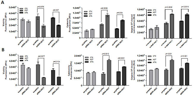 Figure 7: ApoTox-Glo assay of HN13 and HCB289 cell lines transfected with AKT1 siRNA and exposed to cetuximab (CTX) (250 μg/mL) afatinib (AFA) or allitinib (AST) 1 μM, for 24 hours. Viability, cytotocity and caspase 3/7 activation of HN13 (A) and HCB289 (B).