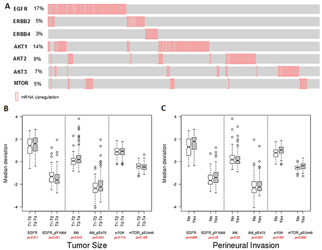 Figure 8: In silico analysis from TCGA HNSCC date. (A) mRNA expression profile of the EGFR, ErbB2, ErbB4, AKT1, AKT2, AKT3 and mTOR. Reverse-phase protein array (RPPA) data and correlations with tumor size (B) and perineural invasion (C) of HNSCC patients.