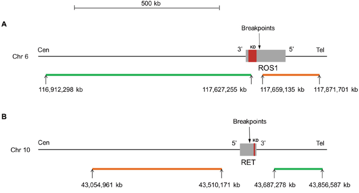 Figure 1: Map for ROS1 (A) and RET (B) dual color break-apart probes (ZytoLight® SPEC ROS1 and RET, ZytoVision). For both genes, the orange and green fluorochrome direct labeled probes hybridize proximal (5' end) and distal (3' end) to the genes, respectively. The known breakpoints in ROS1 are located in introns 31, 33 and 34 and are proximal to the kinase domain (exons 36 to 41). For RET, the known breakpoints are located in introns 10 and 11 and are proximal to the kinase domain (exons 12 to 19). The precise location of the genes on the chromosome, the size (kb) and orientation of the genes are indicated according to the Human assembly GRCh37/hg19. kb: kilobase pair; Cen: centromere; Tel: telomere; Chr: chromosome; KD: kinase domain.