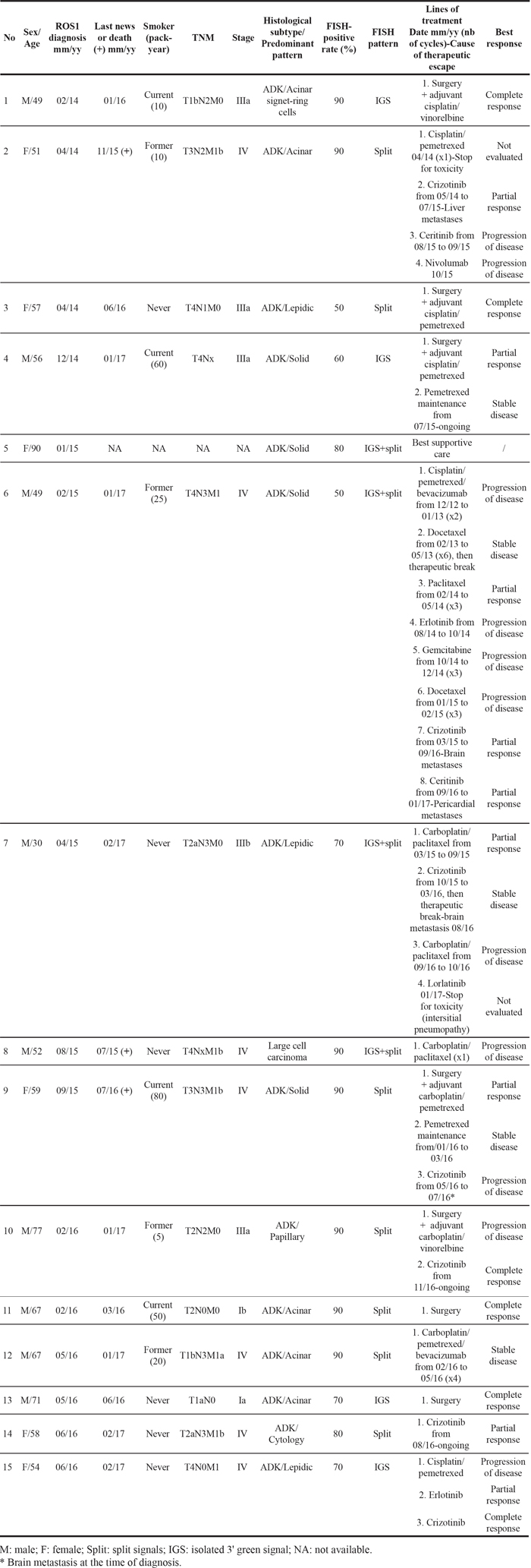 Table 2: Clinical, histological and molecular features of ROS1-rearranged patients