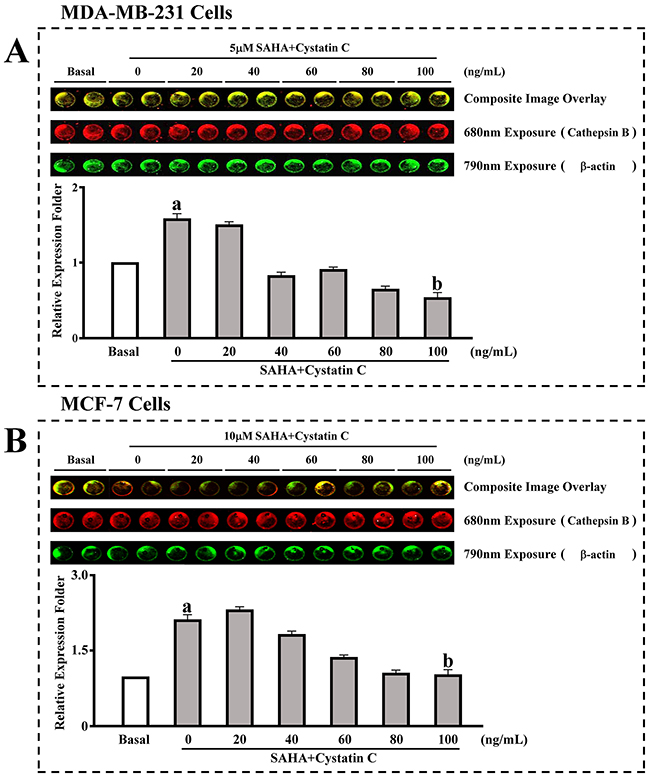 Figure 2: In cell western assay for the effect of SAHA/Cystatin C combination on CTSB. MDA-MB-231 or MCF-7 cells were incubated with 5 μM, 10 μM and different concentrations of Cystatin C. (A) The expression of CTSB in MDA-MB-231cells. (B) The expression of CTSB in MCF-7 cells. (a) p <0.05, (b) p <0.01, when comparing to basal. Data (mean ±standard error) representative results derived from a minimum of 3 independent experiments.