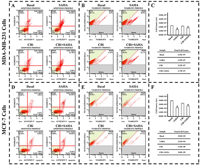 Figure 3: The effect of SAHA/Cystatin C combination on cell viability and apoptosis of cancer cells. MDA-MB-231 or MCF-7 cells were plated in 6-well plate. 5μM SAHA and 100 ng/ml Cystatin C in treatment of MDA-MB-231 cells. 10μM SAHA and 100 ng/ml Cystatin C in treatment of MCF-7 cells. (A) The apoptosis profile in MDA-MB-231. (B) The cell viability profile in MDA-MB-231. (C) The cell number in MDA-MB-231. (D) The apoptosis profile in MCF-7. (E) The cell viability profile in MCF-7. (F) The cell number in MCF-7. (a) p <0.05, when comparing to basal. Data (mean ±standard error) representative results derived from a minimum of 3 independent experiments.