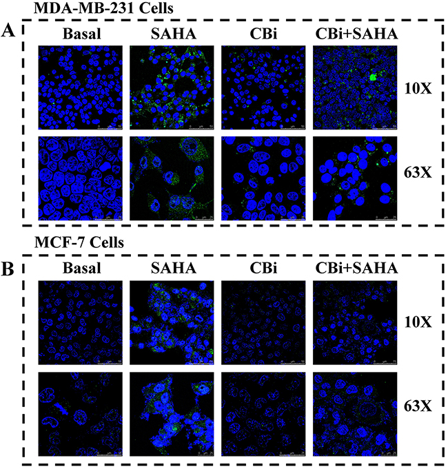 In order to clarify the effects of autophagy by SAHA and Cystatin C in breast cancer cells, we determined LC3II by fluorescence microscopy. The cells grew well and occupied 90% of the full plate in the control treatment of DMSO, without LC3II. On the contrary, there was a large number of LC3II in the cytoplasm of both MDA-MB-231 and MCF-7 cells after SAHA treatment. We observed distinct changes in cancer cells after CBi treatment alone compared to in combined SAHA treatment. For MDA-MB-231 cells, there was a little LC3II after CBi treatment alone, and some LC3II after CBi plus SAHA treatment. For MCF-7 cells, there was no LC3II in the cytoplasm (Figure 4).