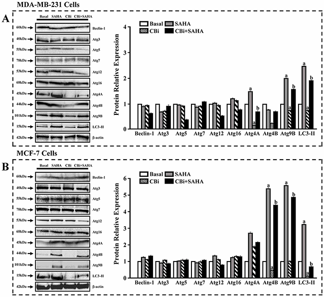 Figure 6: The effects of SAHA and Cystatin C on the expression of ATGs and LC3. Western blot analysis. 5μM SAHA and 100 ng/ml Cystatin C in treatment of MDA-MB-231 cells. 10μM SAHA and 100 ng/ml Cystatin C in treatment of MCF-7 cells. (A) A number of proteins were validated in MDA-MB-231. (B) A number of proteins were validated in MCF-7. (a) p <0.05, (b) p <0.01, when comparing to basal. Data (mean ±standard error) representative results derived from a minimum of 3 independent experiments.
