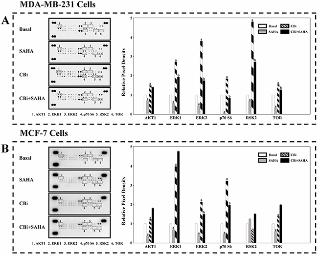 In order to clarify the MAPK signaling mechanisms induced by SAHA and CTSB, we determined a number of protein expression using an antibody array. We found that the trend of CBi and SAHA treatment is similar to CBi alone, which is opposite to SAHA alone. For MDA-MB-231 cells, SAHA only significantly decreased ERK1, ERK2, p70S6 and TOR. CBi only significantly increased AKT1, ERK1, ERK2, p70S6, RSK2 and TOR. SAHA and CBi significantly increased ERK1, ERK2, RSK2 and TOR. For MCF-7 cells, SAHA only significantly decreased AKT1, ERK1, ERK2, p70S6 and TOR. CBi only significantly increased ERK1, ERK2, p70S6 and TOR. SAHA and CBi significantly increased AKT1, ERK1, ERK2, p70S6, RSK2 and TOR (Figure 7).