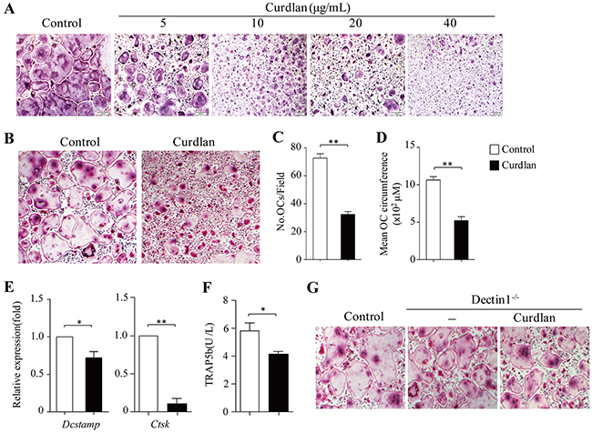 Figure 1: Dectin-1 signaling inhibits osteoclastogenesis. (A-F) Mouse bone marrow cells (BMCs) were cultured with M-CSF for 2 days and with MCSF plus RANKL for 3 days. (A) curdlan at the indicated dosages was added at day 2. Cultures without addition of curdlan were used as controls. Cultures were stained for TRAP+ cells. TRAP+ cells with more than three nuclei were counted as osteoclasts (OCs). (B-F) Cells were treated with or without (control) curdlan (10 μg/mL unless otherwise indicated) at day 2. (B-D) At day 5, cells were stained for TRAP+ cells. (B) Representative TRAP+ cells from the cultures. (C and D) The cell number (C) and mean cell circumference (D) of OCs as obtained in (B). (E and F) At day 5, cells and culture supernatants were collected. (E) qPCR analysis of Dcstamp and Ctsk in cells. Expression was normalized to Gapdh and set at 1 in control cells. (F) ELISA assessed TRAP5b secretion in the cultures. (G) BMCs from dectin1-deficiency (Dectin1-/-) were cultured for OCs with or without (-) curdlan treatment. OCs generated from wild-type (WT) mice were used as control. Data are representative of three independent experiments (B,G) or presented as mean ± SD of at least three independent experiments (C-F). *P < 0.05; **P < 0.01.