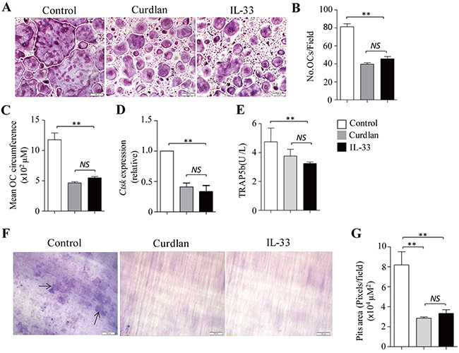 Figure 4: IL-33 inhibits osteoclastogenesis. (A-E) Mouse BMCs were cultured with M-CSF for 2 days and with M-CSF plus RANKL for 3 days. At day 2, cells were treated with curdlan or IL-33 (30 ng/mL), untreated cells were used as control. (A) Shown are representative TRAP+ cells from the cultures. (B) The number of OCs (> 3 nuclei) as obtained in (A). (C) Mean cell circumference of OCs as obtained in (A). (D) qPCR assessed Ctsk expression in the cells. (E) ELISA assessed TRAP5b secretion in the cultures. (F) Mouse BMCs were cultured with M-CSF plus RANKL in the presence or absence (control) of curdlan or IL-33 on dentin slices for 7 days. Shown are the resorption pits on dentin slices. (G) Summarized results of three independent experiments obtained in (F). Data are presented as mean ± SD of at least three (B-E,G) independent experiments. *P < 0.05; **P < 0.01.