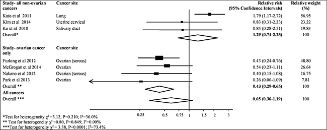 The meta-analyses of progression-free survival included studies published between 2010 and 2014 with five studies from East Asia and two studies from Europe (Table 1). Cancer sample cohorts ranged from 27 to 358. The mean/median follow-up times reported ranged from 2–5 years.