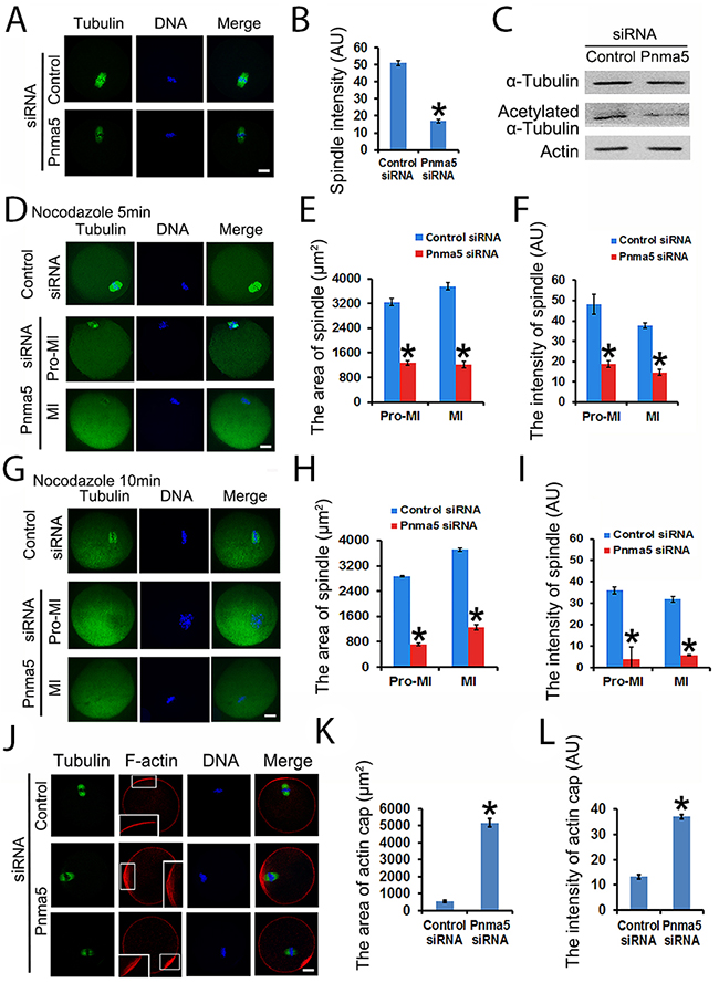 Figure 4: Pnma5 is required for spindle microtubule and F-actin stability. (A), (B) Immunofluorescence showed that Pnma5 knockdown significantly reduced microtubule intensity of MI spindles. n=34 for control, n=40 for Pnma5 knockdown group. (C) Western blot showed that Pnma5 knockdown significantly diminished acetylated α-tubulin level. (D-F) After 5 min of depolymerization, the area and fluorescence intensity of spindle microtubules in Pnma5-knockdown group were significantly smaller than in controls for both pro-MI and MI stage oocytes (control vs Pnma5 knockdown, the area of spindle in pro-MI oocytes, 3246.33 μm2 vs 1270.14 μm2; in MI oocytes, 3756.93μm2 vs 1214.5μm2; the intensity of spindle microtubules in pro-MI oocytes, 48.07 vs 18.88; in MI oocytes, 37.77 vs 14.62). n=16 for control, n=20 for pnma5 knockdown group. (G-I) After 10 min of depolymerization, the differences were even more significant (control vs Pnma5 knockdown, the area of spindle in pro-MI oocytes, 2875.19 μm2 vs 712.72 μm2; in MI oocytes, 3714.27 μm2 vs 1248.54 μm2; the intensity of spindle in pro-MI oocytes, 36.04 vs 4.01; in MI oocytes, 31.91 vs 5.68). n=15 for control, n=18 for Pnma5 knockdown group. (I), (K) Thearea of the actin cap region (control vs Pnma5 knockdown, 530.14 μm2 vs 5157.61 μm2) significantly increased after Pnma5 knockdown. Actin cap regions were zoomed to show the organization of F-actin. Pnma5 knockdown appeared to significantly disrupt F-actin organization at actin cap regions. (J), (L) The fluorescence intensity of F-actin within actin cap region significantly increased after Pnma5 knockdown (control vs Pnma5 knockdown, 11.42 vs 38.3). Tubulin in green, DNA in blue, F-actin in red. Scale bars, 20 μm. Data are represented as mean+/- SEM. Significant differences are labeled with an asterisk (*).