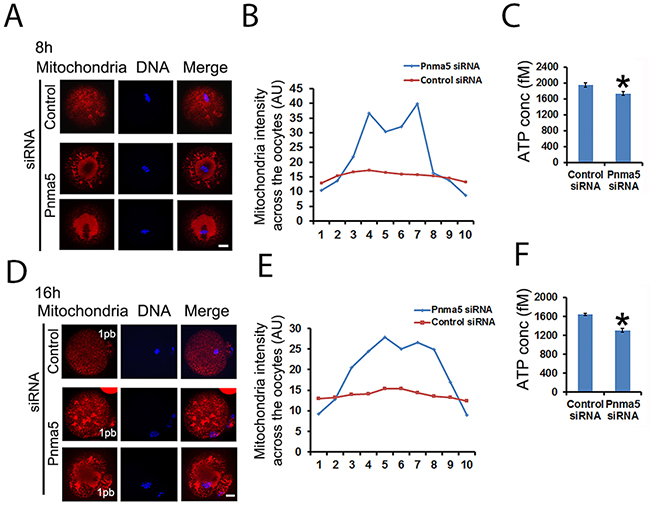 Figure 5: Pnma5 is required for mitochondria dynamics and function. (A), (B) and (D, E) At both 8 h (A) and 16 h (D) of IVM, the mitochondria were dispersed as small particles throughout the cytoplasm of control oocytes and had moderately higher concentration around MI spindles; while in the cytoplasm of Pnma5-knockdown oocytes, the mitochondria formed many big aggregates around spindles. Next oocytes were subdivided into ten parallel sub-regions and careful measurement of the mitochondria intensity of each sub-regions also showed that mitochondria intensity seemed much higher in the center than at cortex (B, E). (C) and (F) Accordingly, ATP levels were significantly lower in Pnma5-knockdown oocytes than in controls. Mitochondria in red, DNA in blue. 1pb, first polar body. n=3 for each group. Scale bars, 20 μm. Data are represented as mean+/- SEM. Significant differences are labeled with an asterisk (*).