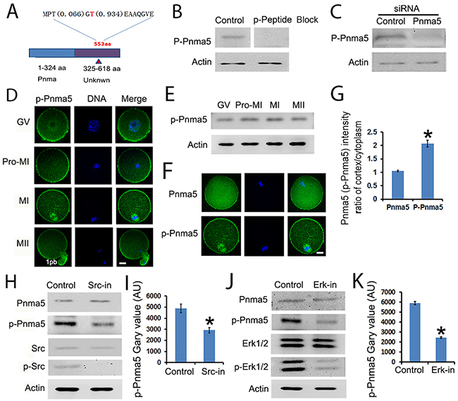 Figure 6: The activity of Pnma5 is regulated by phosphorylation. (A) Through phospho-peptide enrichment and LC-MS after IP, an attractive site was identified at Thr553 (phosphorylation possibility 93.4%) in the non-defined domain of Pnma5 and a phospho antibody specific to Thr553 (p-Pnma5) was generated. (B, C) The specificity of p-Pnma5 antibody was confirmed using both phospho peptide blocking-blot (B) and siRNA knockdown-blot (C). (D) Immunolocalization showed that phosphorylated Pnma5 (p-Pnma5) had significantly stronger concentration both at cortical regions from GV to MII and within spindle regions at MI oocytes. (E) p-Pnma5 remained constant during oocytes maturation process through Western Blot. (F) and (G) Fluorescence intensity quantification of cortical t-Pnma5 or p-Pnma5 in MI oocytes showed that the cortical intensity of p-Pnma5 was much higher than t-Pnma5 (t-Pnma5 vs p-Pnma5, 1.05 vs 2.07). n=35 for t-Pnma5, n=38 for p-Pnma5 knockdown group. (H) and (I) Western blot showed that inhibition of Src phosphorylation significantly decreased p-Pnma5, n=3 for each group. (J) and (K) Western blot showed that inhibition of Erk 1/2 phosphorylation also significantly decreased p-Pnma5. n=3 for each group. Pnma5 or p-Pnma5 in green, DNA in blue. 1pb, first polar body. Scale bars, 20 μm. Data are represented as mean+/- SEM. Significant differences are labeled with an asterisk (*).