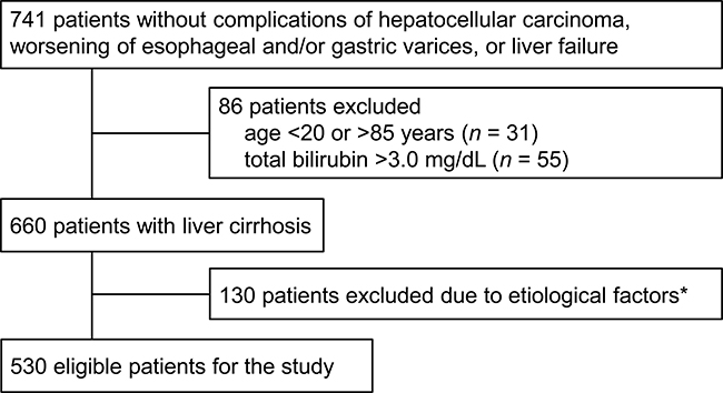 Among 1,223 patients with liver cirrhosis who first visited Saiseikai Niigata Daini Hospital from February 2000 to May 2012, 741 met the selection criteria. As shown in Figure 1, 530 patients were finally selected for the study analysis in accordance with the other selection criteria of age, total bilirubin level, and etiology of liver cirrhosis. Baseline patient characteristics are shown in Table 1.