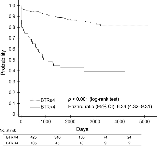 This study was a single-center, retrospective, observational cohort study to evaluate the clinical significance of the BTR as a predictive factor in patients with liver cirrhosis. Medical records and information from Saiseikai Niigata Daini Hospital were analyzed. Since this was a retrospective study using existing medical records and information, informed consent was not required. However, study patients were given the opportunity to refuse the release of their medical records and information for analysis after study approval had been obtained from the Medical Ethical Committee of Saiseikai Niigata Daini Hospital.