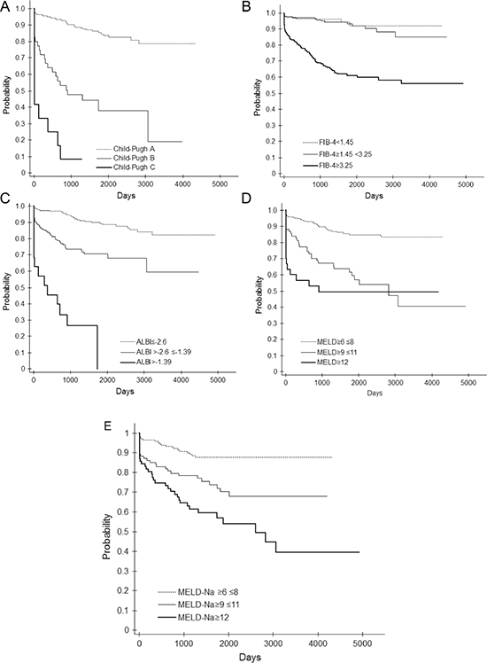 Several disease severity evaluations based on values from laboratory tests are clinically utilized due to their low cost and repeatability. The Child-Pugh score is based on clinical symptoms (ascites and encephalopathy), bilirubin and albumin levels, and prothrombin time [6]. The MELD score is calculated from creatinine and bilirubin levels and the International Normalized Ratio of prothrombin time [9]. It was reported that the Child-Pugh and MELD scores are good predictors of the prognosis of liver cirrhosis patients in the clinical setting, although the MELD score is superior to the Child-Pugh score because it does not involve clinical symptoms [17]. Since the sodium level itself is an independent predictive factor of liver cirrhosis prognosis, the MELD-Na score including the sodium level is also utilized [18]. The ALBI grade calculated from albumin and bilirubin levels is considered to be a prognosis predictor like the Child-Pugh score in patients with hepatocellular carcinoma [19]. The FIB-4 index is scored based on age, AST and ALT levels, and platelet count [7] and was also reported to be a prognosis predictor [20]. The present study also found that these indexes predicted the prognosis of liver cirrhosis.
