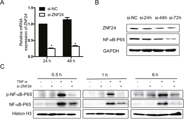 Figure 3: Effect of ZNF24 on NF-κB. (A) RT-qPCR analysis of ZNF24 mRNA expression level after siRNA transfection treatment in GM0639 cells for 24 and 48 h. Nontargeting siRNA (si-NC) was used as a control. Data is represented as mean ± SD. (B) ZNF24 knockdown reduced p65 expression as determined by western blot analysis. Nontargeting siRNA treatment was used as a control. Protein loading was evaluated by β-actin. (C) Downregulation of ZNF24 markedly inhibited TNF-α-induced NF-κB activation. GM0639 cells were treated with siRNA transfection for 48 h and then with TNF-α (1 nM) for the indicated times. Nuclear extracts were prepared and analyzed by western blot using antibodies against p65 and phospho-specific p65 (Ser 536). Nontargeting siRNA treatment was used as a control. Histon-H3 was detected as the loading control. Each assay was performed in triplicate. *p < 0.001.