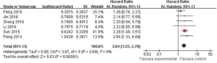 In the subgroup analysis by ethnicity, the expression of HULC was significantly associated with OS in Chinese patients (HR = 2.04; 95% CI 1.55 – 2.70; P< 0.00001; Figure 2).