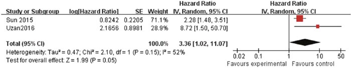 In the subgroup analysis by cancer type, HULC was associated with OS in osteosarcoma patients (HR = 3.36; 95% CI 1.02 – 11.07; P= 0.05; Figure 3) and in gastric cancer patients (HR = 2.17; 95% CI 1.08 – 4.38; P= 0.03; Figure 4.