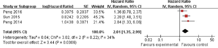 The sensitivity analysis was assessed to see the stability of the meta-analysis. A significant association was found in studies with adjustment (HR = 2.01; 95% CI 1.35 – 2.99; P= 0.0006; Figure 5).