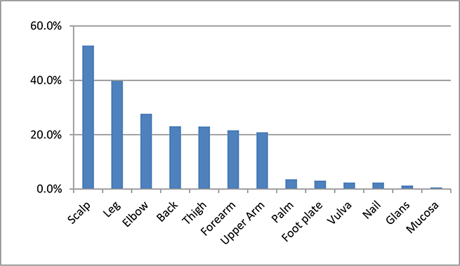 Consistent with the finding of the 1984 nationwide survey in China, we found that most Chinese patients suffered from psoriasis vulgaris (96.5%), of which plaque was the dominant type (51.1%) [16]. When assessed by BSA involvement, more patients were categorized as having moderate-to-severe psoriasis in our study (57.3%) than that in the 1984 nationwide survey (37.2) [16]. The difference may be partially explained by different study design and changes in environments and health-care seeking behaviors.