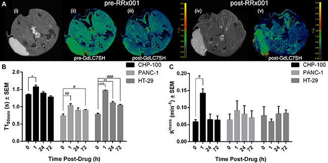 Figure 3: Gd-LC7-SH MRI of 3 tumor models. (A) Anatomic reference images and example T1 maps before and 50 min after Gd-LC7-SH of a mouse bearing a HT-29 tumor xenograft; the color scale runs from 0 s (dark blue) through 3 s (yellow). Before treatment with RRx-001 (panel (iii)) the T1 of both tumor and muscle are significantly lower post-Gd-LC7-SH relative to pre-Gd-LC7-SH (panel (ii)). 24 h after RRx-001 exposure the T150 min of tumor is higher than expected (panel (v)), consistent with a rapid clearance of Gd-LC7-SH from the treated tumor. (B) Tumor T1 (mean ± S.E.M., n = 4) measured 50 min post-Gd-LC7-SH, before vs. 1–72 h after treatment with RRx-001 (10 mg/kg, i.v.). In all three tumors, the T150 min at 1 h post-treatment with RRx-001 was significantly higher than pre-treatment T150 min (*p = 0.014, ##p = 0.006, ***p = 7 × 10−5). In HT-29 and PANC-1 tumors this effect of RRx-001 on tumor T150 min was apparent even at 72 h post-drug (#p = 0.047, **p = 0.001, ###p = 7 × 10−4). (C) Ktrans, a measure of tumor perfusion measured by DCE-MRI, before vs. after treatment with RRx-001 (10 mg/kg, i.v.). In CHP-100 tumors, tumor perfusion was significantly higher 1 h post-treatment with RRx-001 relative to baseline (#p = 0.003).