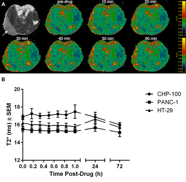 Figure 4: BOLD MRI of 3 tumor models. (A) Anatomic reference images and example T2* maps acquired in a mouse bearing a CHP-100 tumor (arrow); the color scale runs from 0 ms (dark blue) through 50 ms (yellow). (B) T2* maps were acquired before and through 60 min after RRx-001 treatment, and again at 24 h and 72 h post-drug. The variation of tumor T2* (mean ± S.E.M., n = 4) before vs. after treatment with RRx-001 (10 mg/kg, i.v.).